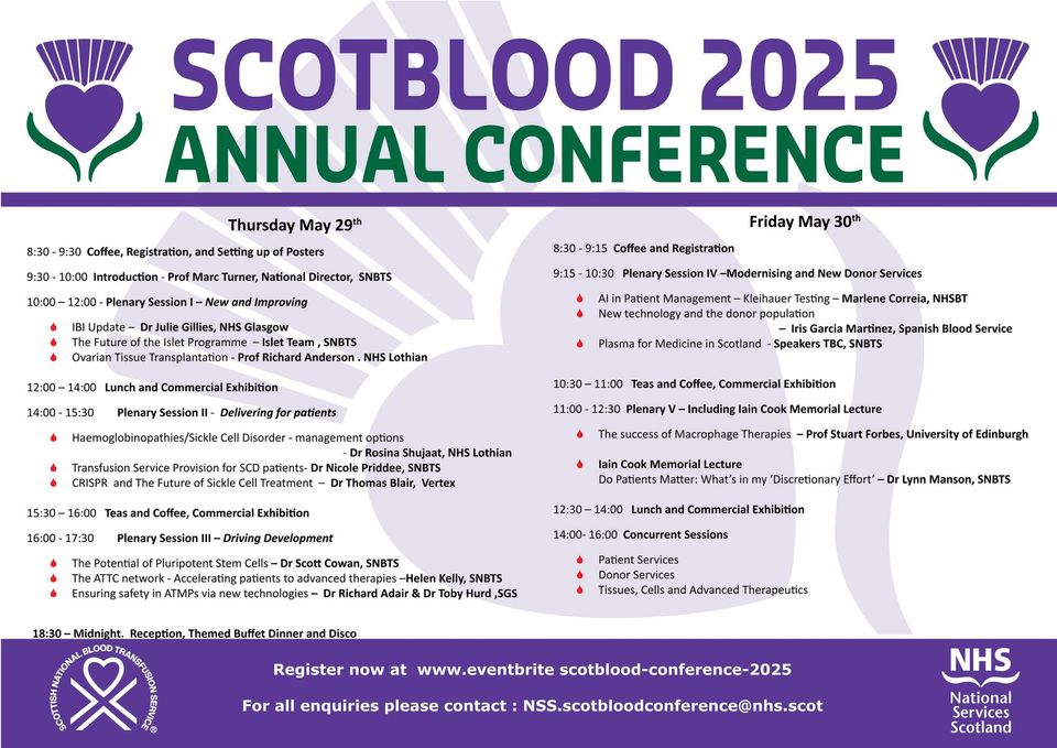 Annual Scotblood conference is taking place Thursday 29th and Friday 30th of May and will be held at Stirling University. The programme for this year's Conference includes national and international speakers discussing how we can improve patient and donor care using existing and new novel applications in the field of transfusion and transplantation. The Thursday programme will discuss both the current treatment and management of sickle cell disease and how a novel cellular therapy will treat this condition in the future. Furthermore, we will also be look at the introduction of innovations in the blood service and transplantation to ensure safety is maintained and improved. The Friday programme will be focusing on how new technologies such as AI may be able to assist in the field of transplantation and transfusion. Additionally, Professor Stuart Forbes will be discussing the recent successes in the use of macrophage therapies for the treatment of liver disease.
