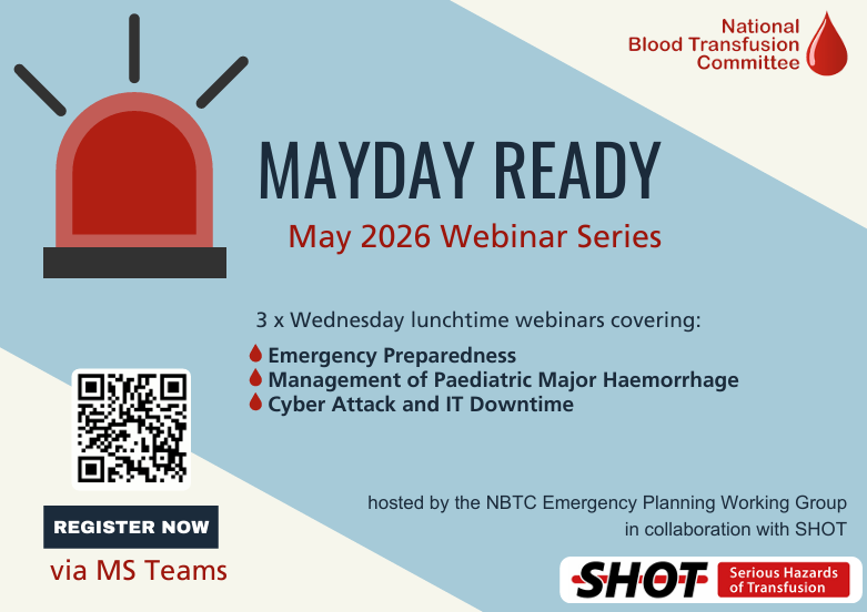 In May 2026, the NBTC's Emergency Planning working group (EPWG) in collaboration with Serious Hazards of Transfusion Haemovigilance Scheme (SHOT) are hosting a series of webinars.