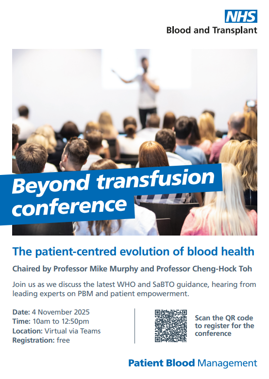 Join the PBM England team on the 4th November for a Patient Blood Management (PBM) webinar, as part of their PBM Awareness Week celebrations. With insights from global leaders, and the latest on informed decision-making, consent, and the shift to considering blood as a vital organ. Whether you're new to PBM or experienced in implementing and delivering PBM in clinical care, this session offers practical tools and fresh insights to support you in delivering evidenced based best practice.